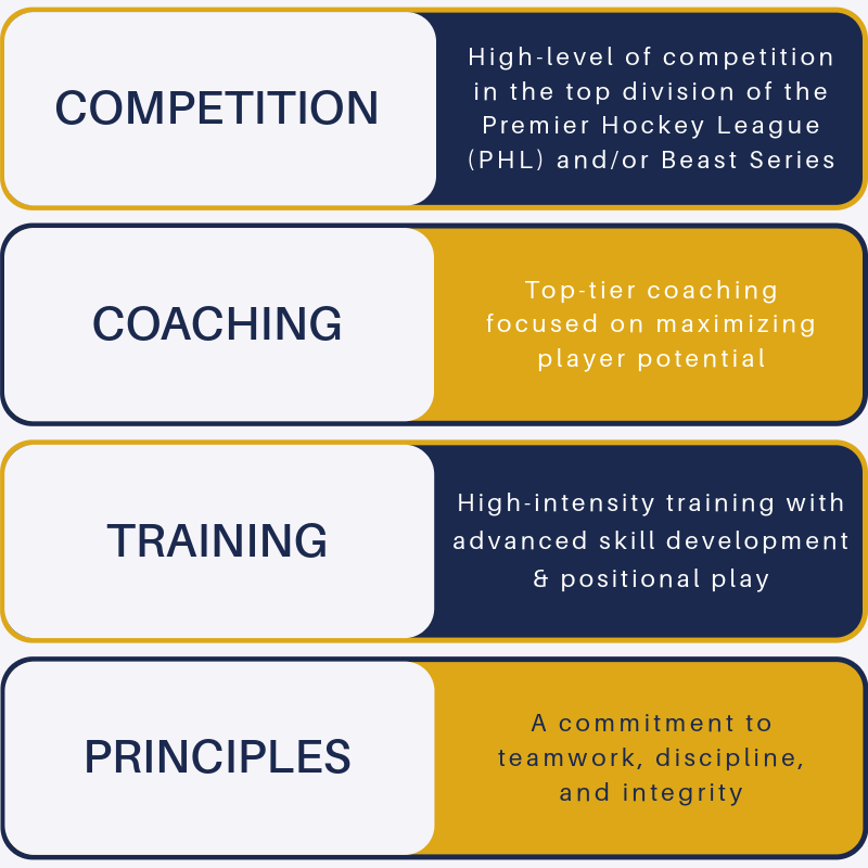 Premier: Our Premier Teams foster a calculated, high-tempo training environment, ensuring players refine fundamentals, expand their skill set, and build a deeper understanding of the game. At Mass Admirals, we are dedicated to doing things the right way—providing a structured, competitive environment that challenges players to grow, develop, and excel on and off the ice.